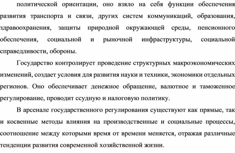 Государство контролирует проведение структурных макроэкономических изменений, создает условия для развития науки и техники, экономики отдельных регионов. Оно обеспечивает денежное обращение, валютное и таможенное регулирование, проводит ссудную и налоговую политику.