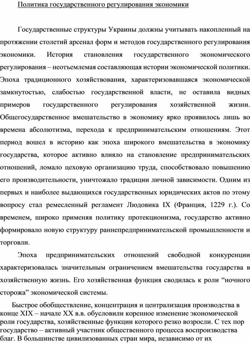 Государственные структуры Украины должны учитывать накопленный на протяжении столетий арсенал форм и методов государственного регулирования экономики. История становления государственного экономического регулирования – неотъемлемая составляющая истории экономической политики. Эпоха традиционного хозяйствования, характеризовавшаяся экономической замкнутостью, слабостью государственной власти, не оставила видных примеров государственного регулирования хозяйственной жизни. Общегосударственное вмешательство в экономику ярко проявилось лишь во времена абсолютизма, перехода к предпринимательским отношениям. Этот период вошел в историю как эпоха широкого вмешательства в экономику государства, которое активно влияло на становление предпринимательских отношений, ломало цеховую организацию труда, способствовало повышению его производительности, уничтожало традиции личной зависимости. Одним из первых и наиболее выдающихся государственных юридических актов по этому вопросу стал ремесленный регламент Людовика IХ (Франция, 1229 г.). Со временем, широко применяя политику протекционизма, государство активно формировало новую структуру раннепредпринимательской промышленности и торговли.