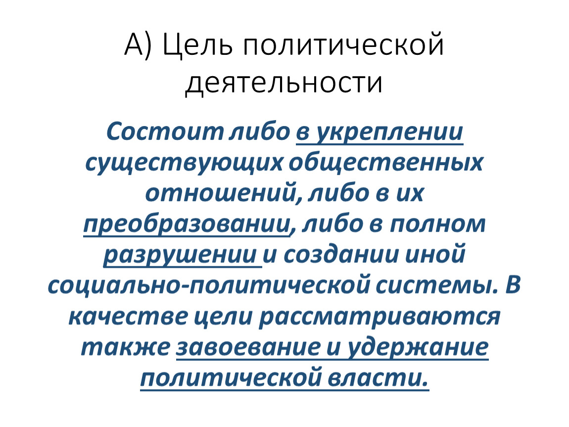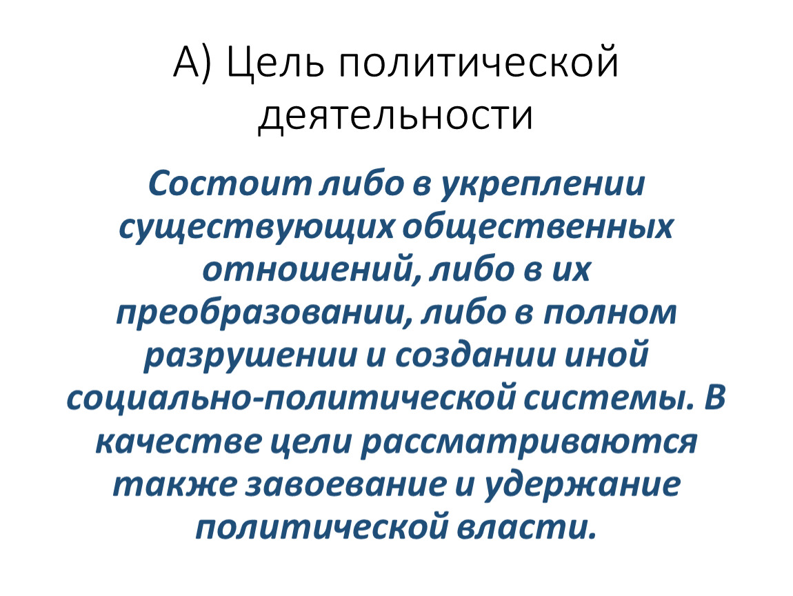 А) Цель политической деятельности