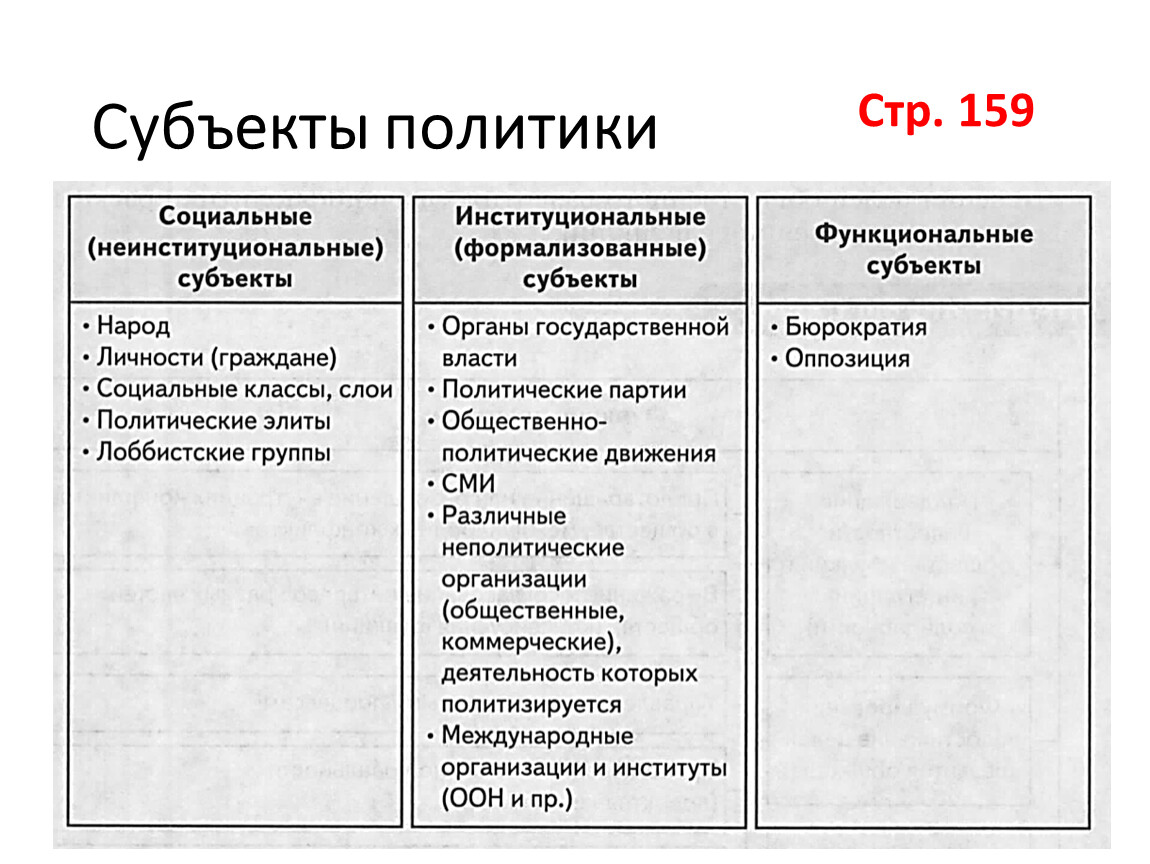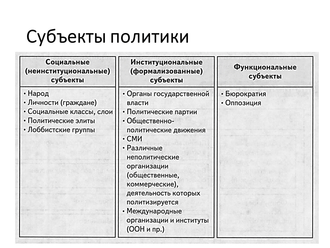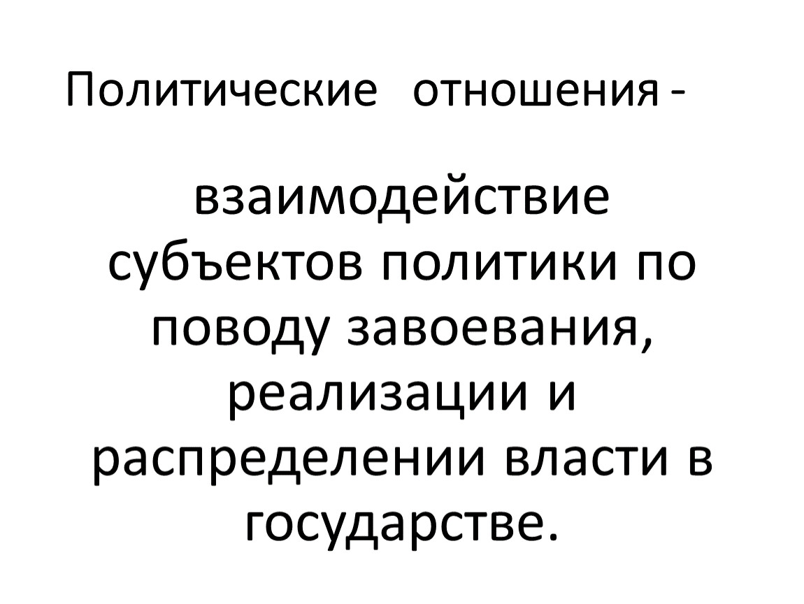 взаимодействие субъектов политики по поводу завоевания, реализации и распределении власти в государстве.