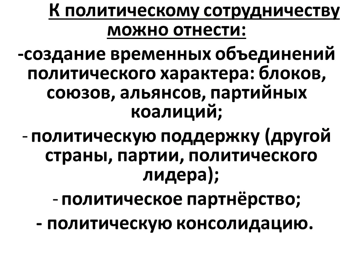 -создание временных объединений политического характера: блоков, союзов, альянсов, партийных коалиций;