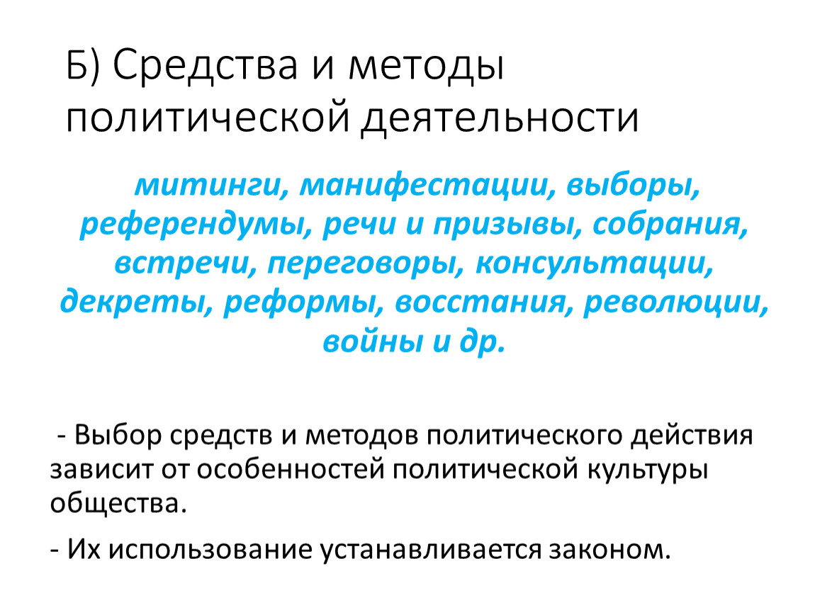 Б) Средства и методы политической деятельности