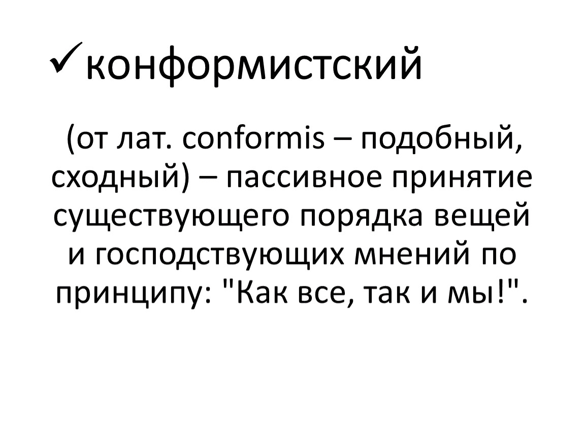 (от лат. conformis – подобный, сходный) – пассивное принятие существующего порядка вещей и господствующих мнений по принципу: "Как все, так и мы!".