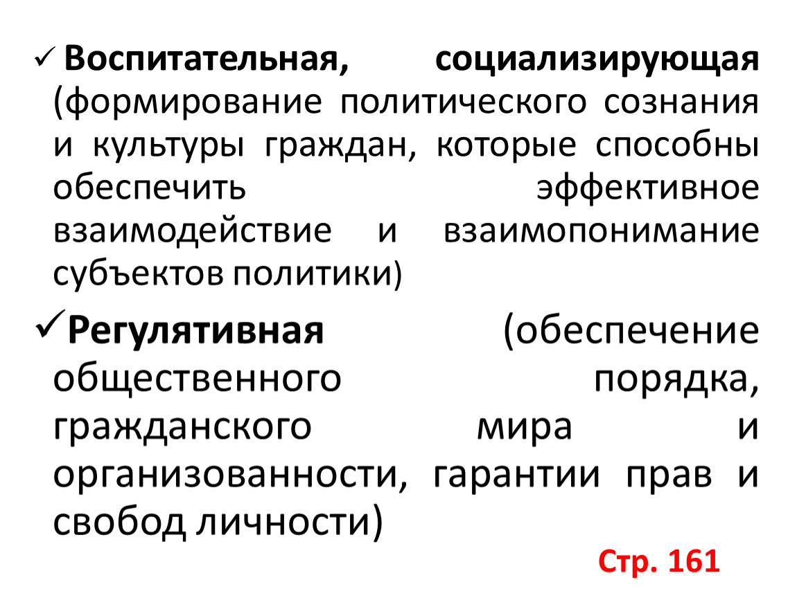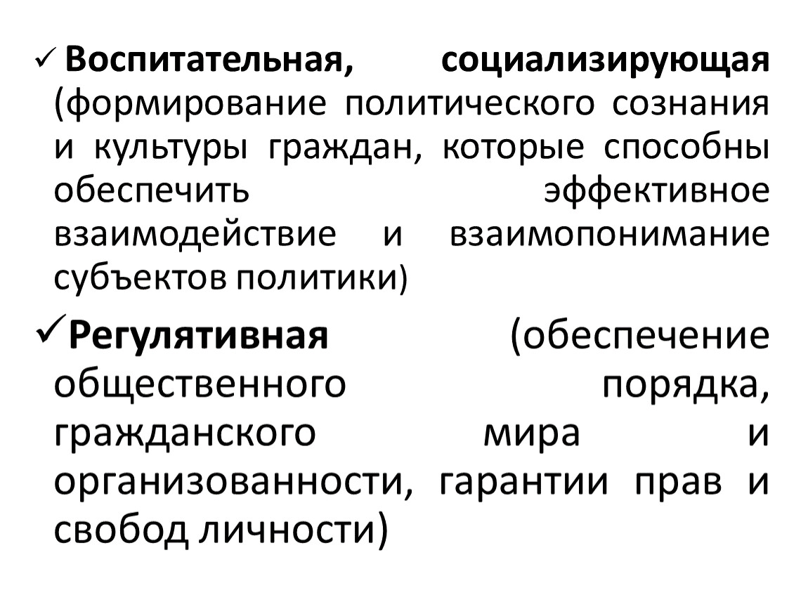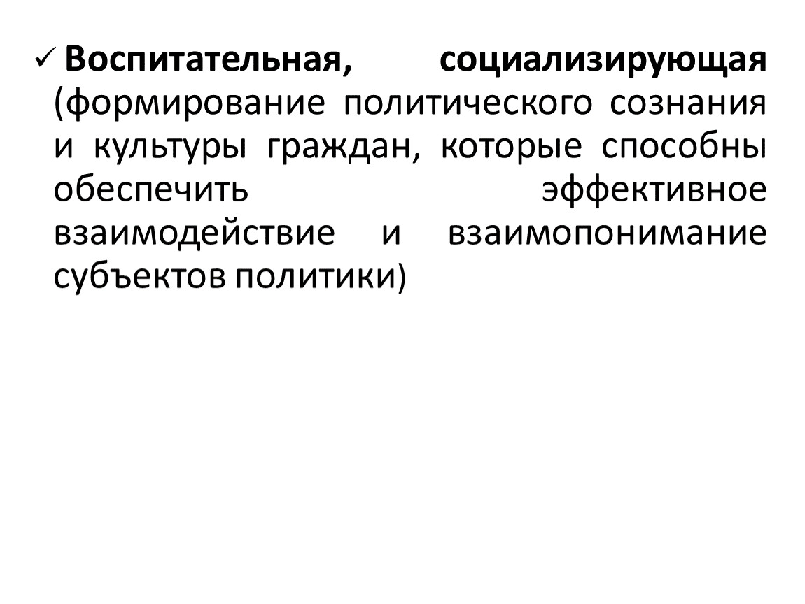 Воспитательная, социализирующая (формирование политического сознания и культуры граждан, которые способны обеспечить эффективное взаимодействие и взаимопонимание субъектов политики)