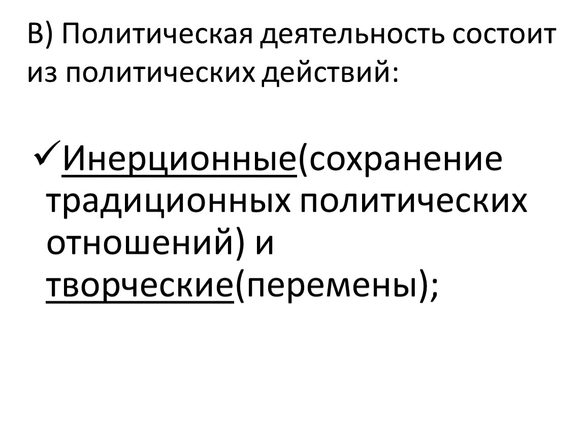 Инерционные(сохранение традиционных политических отношений) и творческие(перемены);