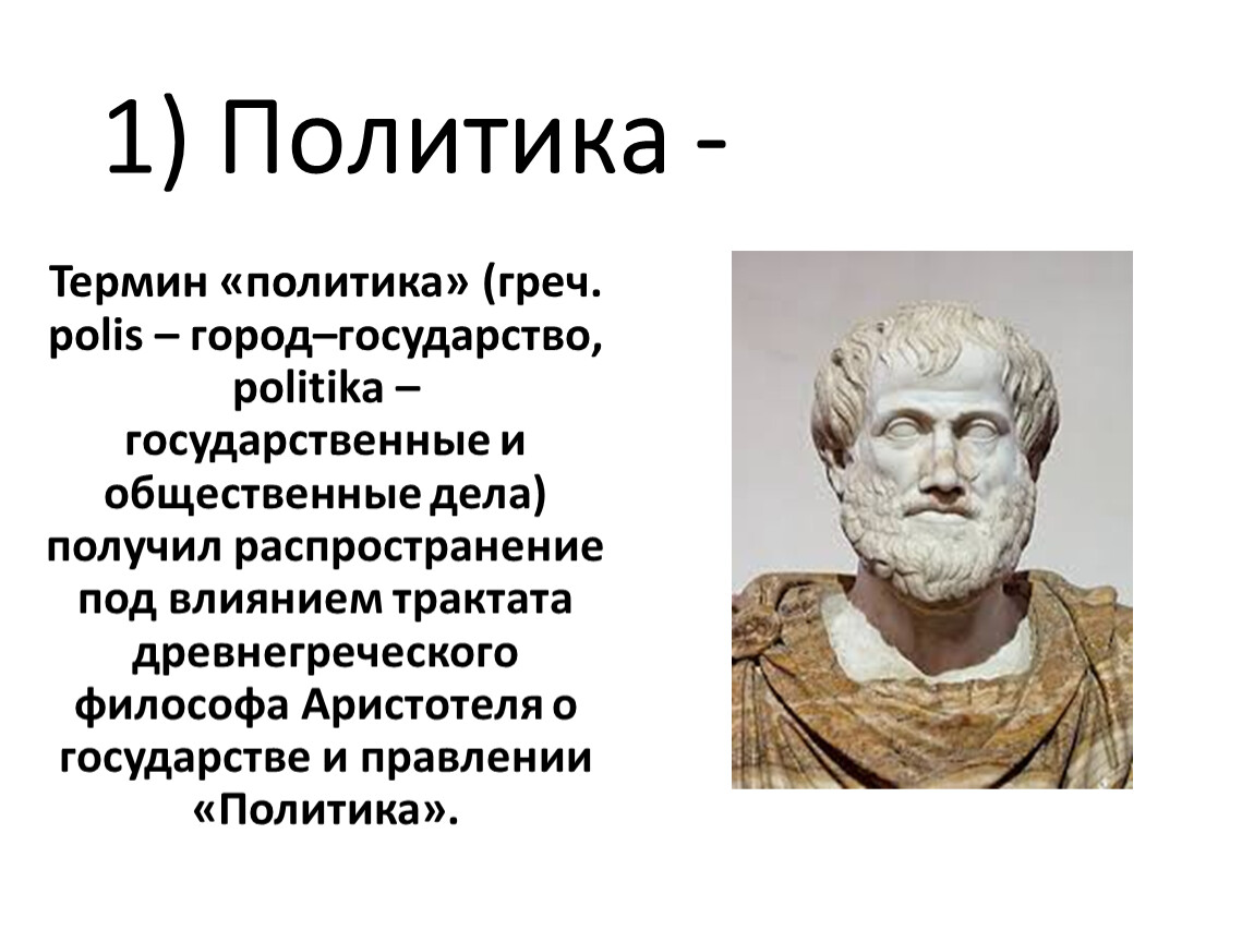 Термин «политика» (греч. polis – город–государство, politika – государственные и общественные дела) получил распространение под влиянием трактата древнегреческого философа Аристотеля о государстве и правлении «Политика».