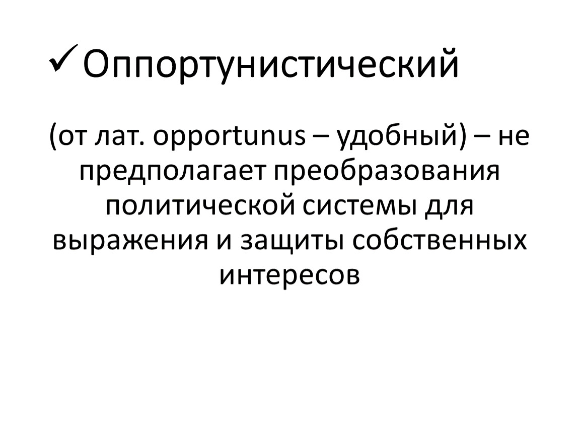 (от лат. opportunus – удобный) – не предполагает преобразования политической системы для выражения и защиты собственных интересов