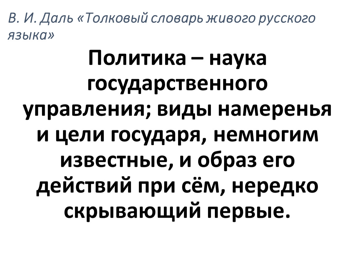 Политика – наука государственного управления; виды намеренья и цели государя, немногим известные, и образ его действий при сём, нередко скрывающий первые.