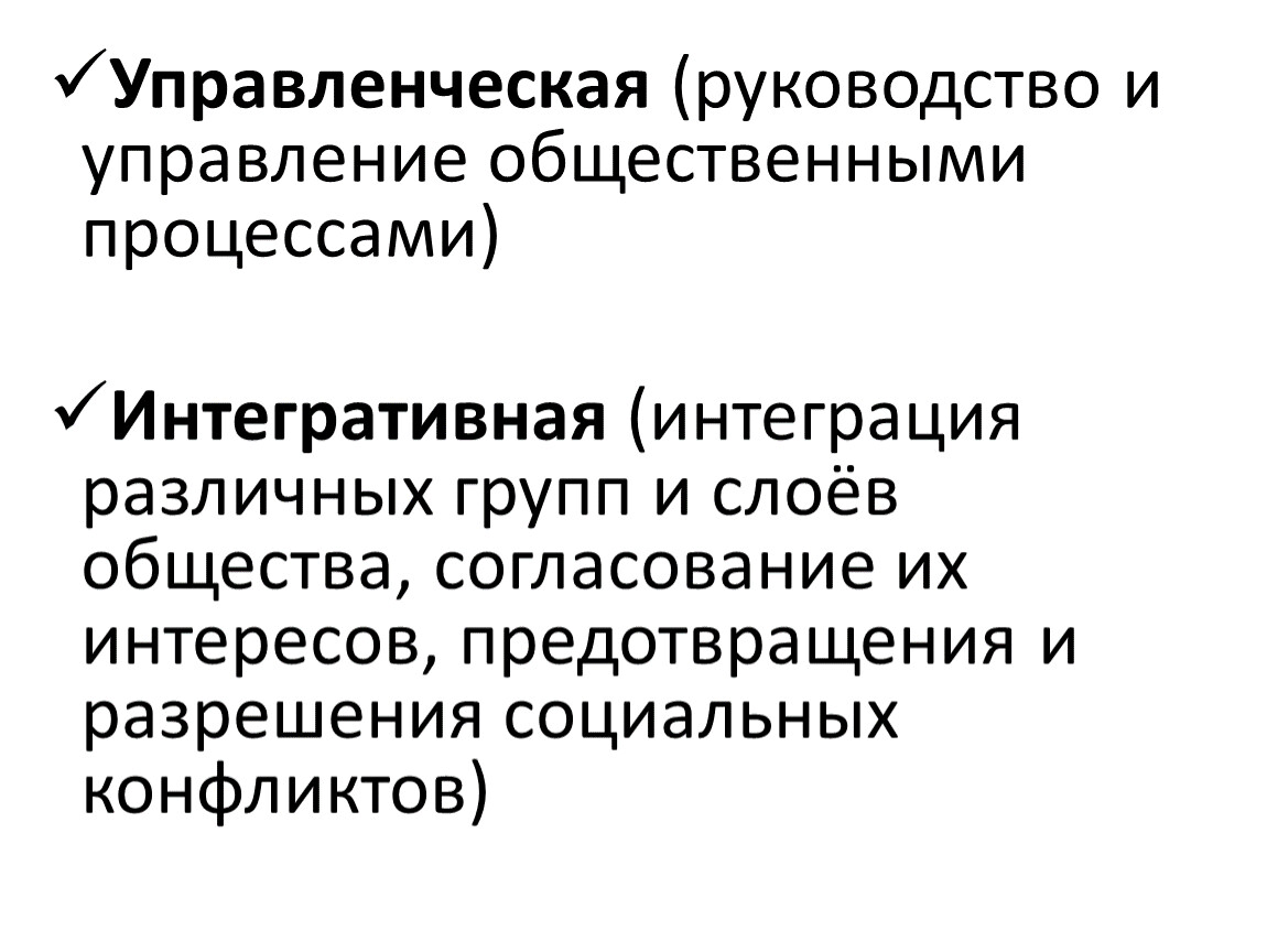 Интегративная (интеграция различных групп и слоёв общества, согласование их интересов, предотвращения и разрешения социальных конфликтов)