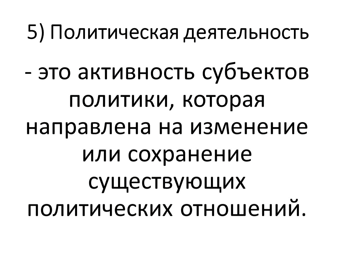 - это активность субъектов политики, которая направлена на изменение или сохранение существующих политических отношений.