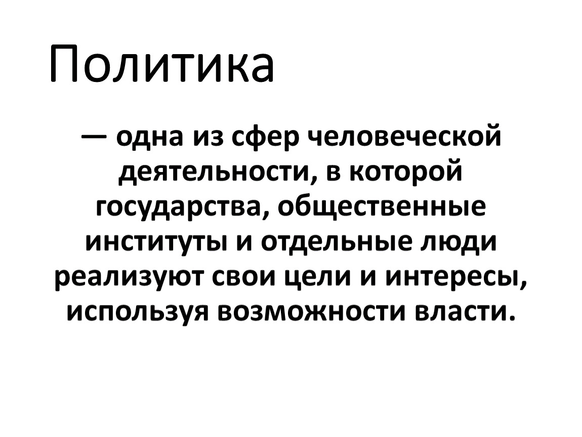 — одна из сфер человеческой деятельности, в которой государства, общественные институты и отдельные люди реализуют свои цели и интересы, используя возможности власти.