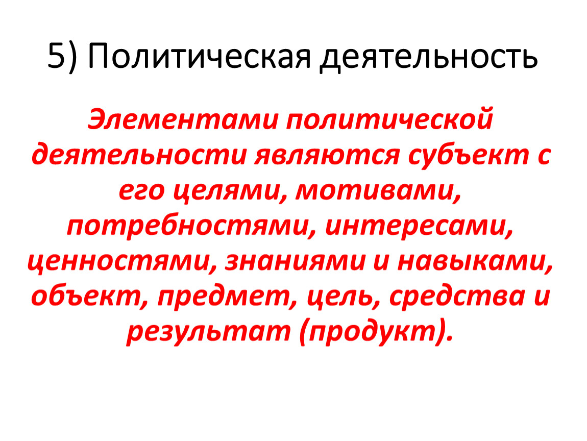 Элементами политической деятельности являются субъект с его целями, мотивами, потребностями, интересами, ценностями, знаниями и навыками, объект, предмет, цель, средства и результат (продукт).