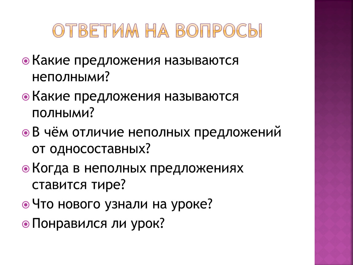 Неполным называется предложение, в котором пропущен какой-либо член – главный или второстепенный, но он легко восстанавливается по смыслу из контекста: Неполные предложения характерны для диалога.