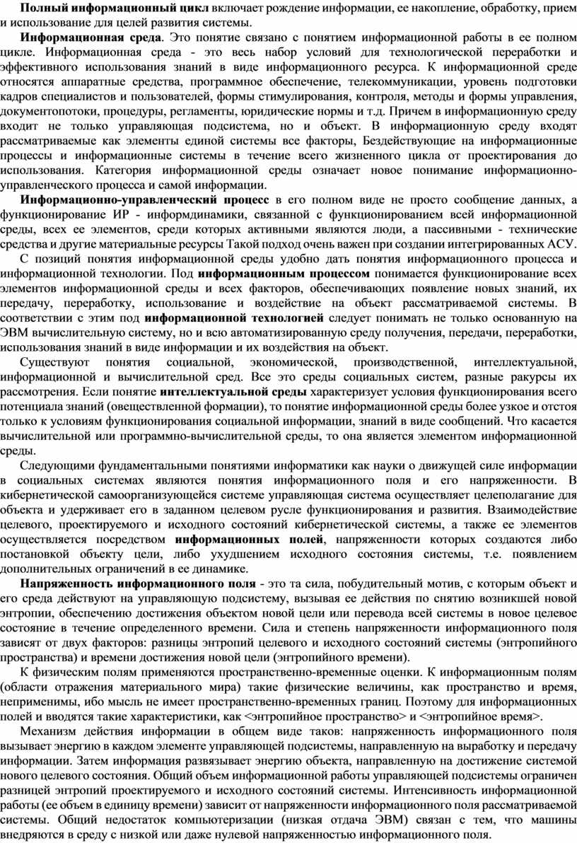 Информационная среда. Это понятие связано с понятием информационной работы в ее полном цикле. Информационная среда - это весь набор условий для технологической переработки и эффективного использования знаний в виде информационного ресурса. К информационной среде относятся аппаратные средства, программное обеспечение, телекоммуникации, уровень подготовки кадров специалистов и пользователей, формы стимулирования, контроля, методы и формы управления, документопотоки, процедуры, регламенты, юридические нормы и т.д. Причем в информационную среду входит не только управляющая подсистема, но и объект. В информационную среду входят рассматриваемые как элементы единой системы все факторы, Бездействующие на информационные процессы и информационные системы в течение всего жизненного цикла от проектирования до использования. Категория информационной среды означает новое понимание информационно-управленческого процесса и самой информации.