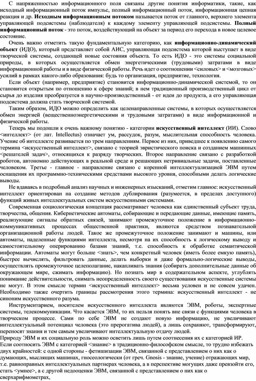 С напряженностью информационного поля связаны другие понятия информатики, такие, как исходный информационный поток импульс, полный информационный поток, информационная цепная реакция и др. Исходным информационным потоком называется поток от главного, верхнего элемента управляющей подсистемы (наблюдателя) к каждому элементу управляющей подсистемы. Полный информационный поток - это поток, воздействующий на объект за период его перехода в новое целевое состояние.