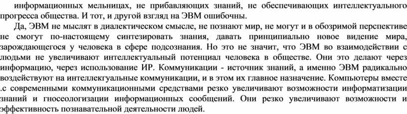 Да, ЭВМ не мыслят в диалектическом смысле, не познают мир, не могут и в обозримой перспективе не смогут по-настоящему синтезировать знания, давать принципиально новое видение мира, зарождающегося у человека в сфере подсознания. Но это не значит, что ЭВМ во взаимодействии с людьми не увеличивают интеллектуальный потенциал человека в обществе. Они это делают через информацию, через использование ИР. Коммуникации - источник знаний, а именно ЭВМ радикально воздействуют на интеллекгуальные коммуникации, и в этом их главное назначение. Компьютеры вместе .с современными коммуникационными средствами резко увеличивают возможности информатизации знаний и гносеологизации информационных сообщений. Они резко увеличивают возможности и эффективность познавательной деятельности людей.