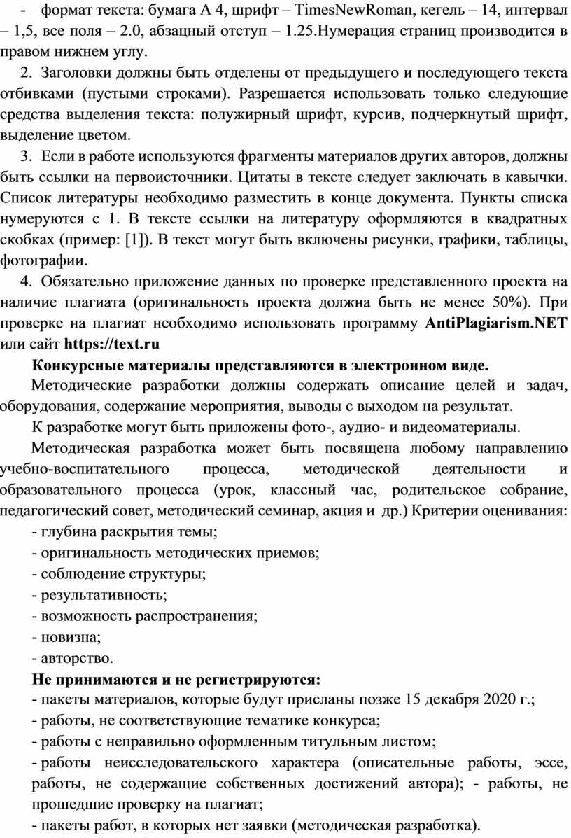 - работы неисследовательского характера (описательные работы, эссе, работы, не содержащие собственных достижений автора); - работы, не прошедшие проверку на плагиат;