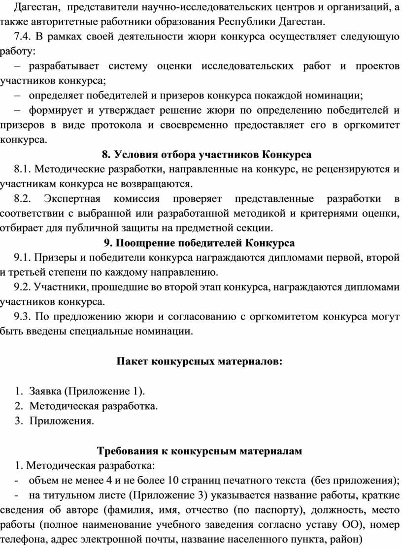 7.3. В состав жюри конкурса входят преподаватели, сотрудники общеобразовательных и высших образовательных учреждений Республики Дагестан, представители научно-исследовательских центров и организаций, а также авторитетные работники образования Республики Дагестан.