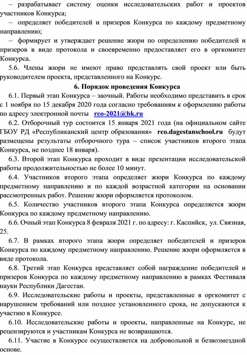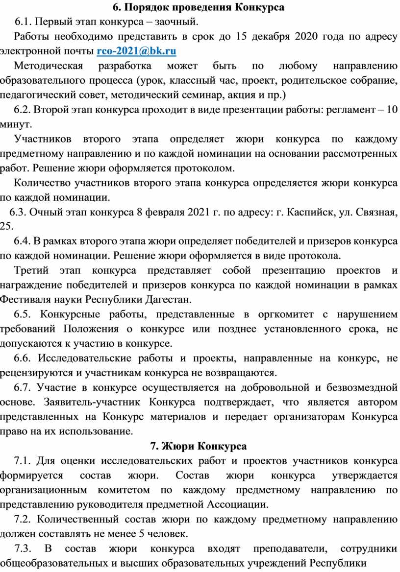 6.1. Первый этап Конкурса – заочный. Работы необходимо представить в срок с 1 ноября по 15 декабря 2020 года согласно требованиям к оформлению работы по адресу электронной почты rco-2021@bk.ru