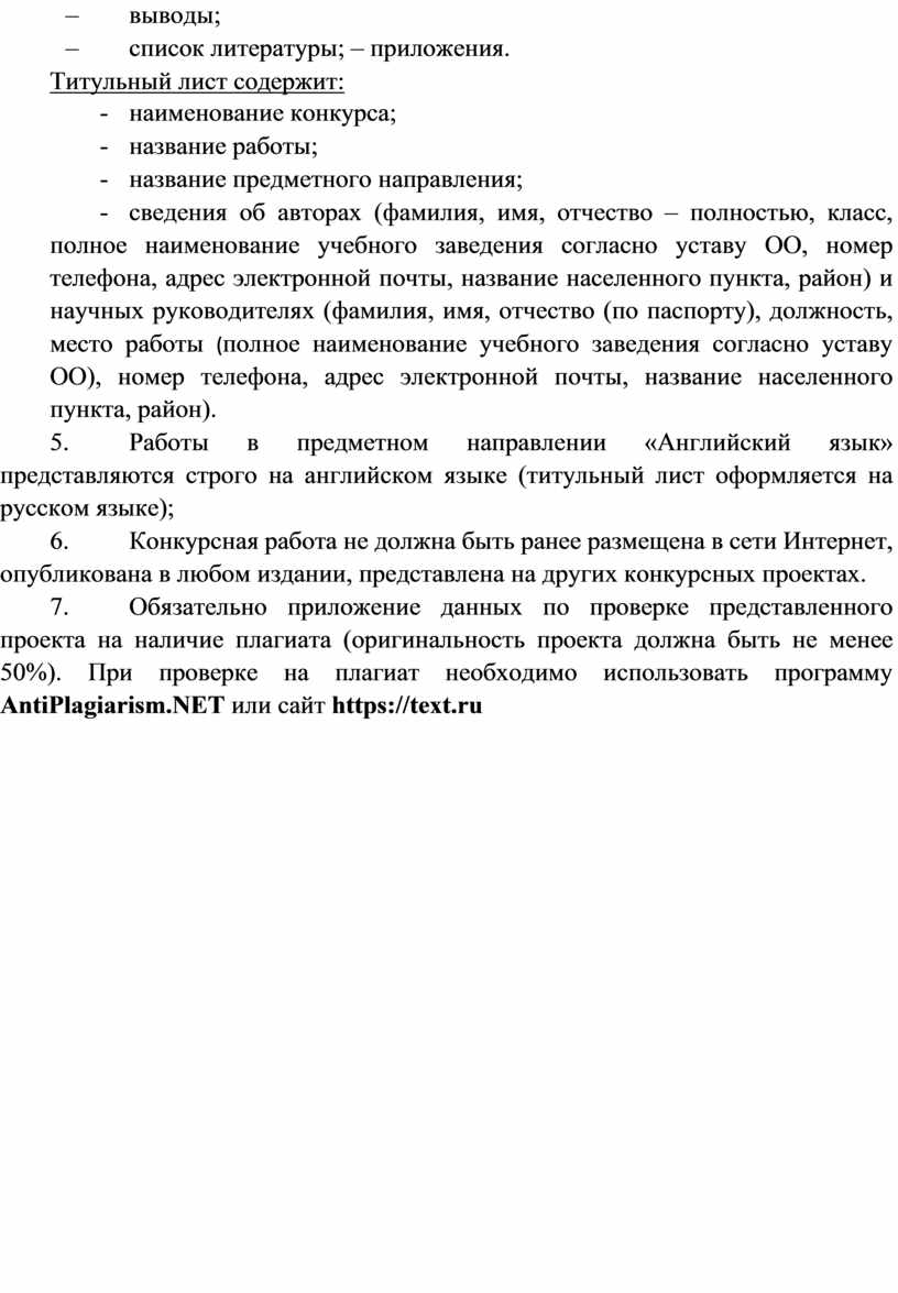4. Обязательно приложение данных по проверке представленного проекта на наличие плагиата (оригинальность проекта должна быть не менее 50%). При проверке на плагиат необходимо использовать программу AntiPlagiarism.NET или сайт https://text.ru