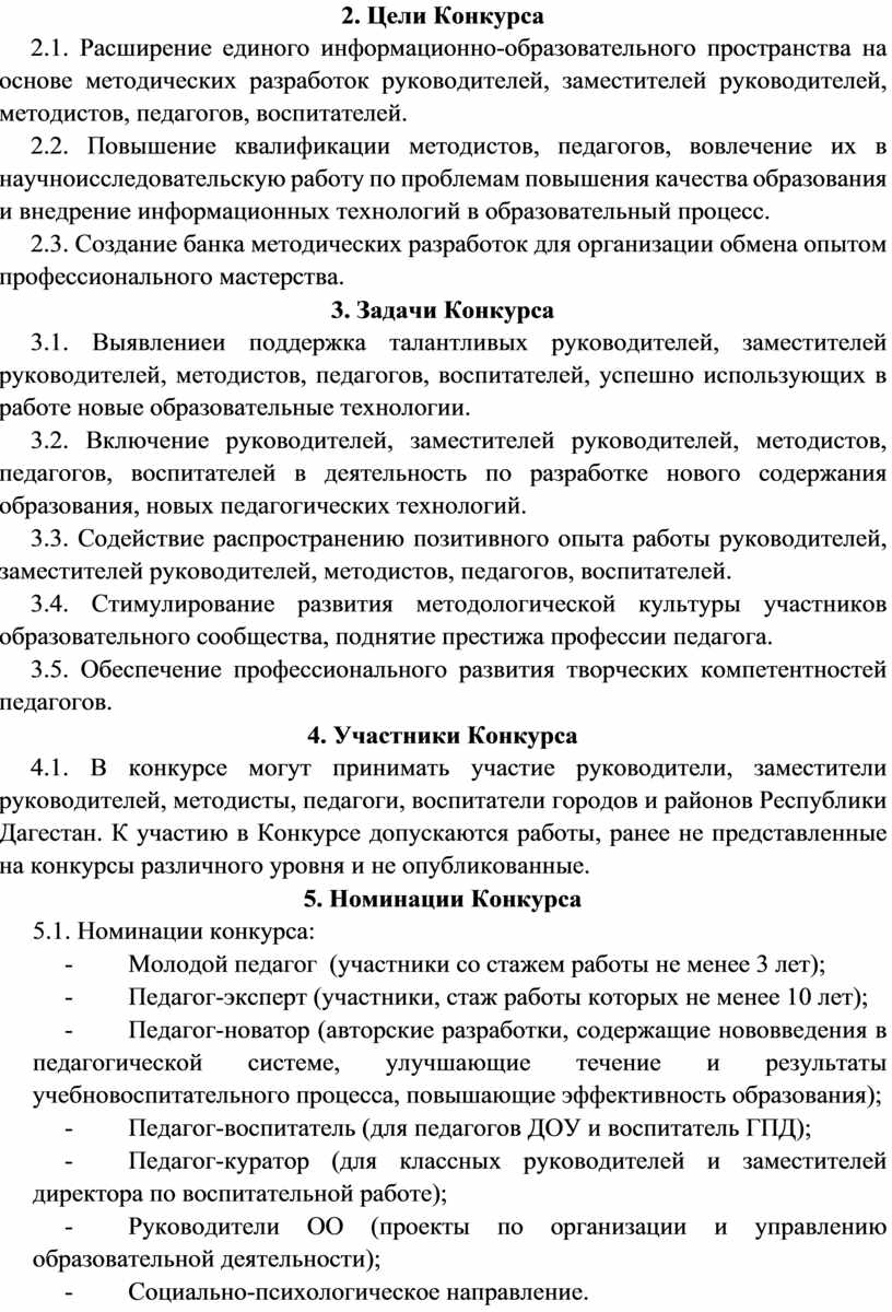 4.1. В конкурсе могут принимать участие руководители, заместители руководителей, методисты, педагоги, воспитатели городов и районов Республики Дагестан. К участию в Конкурсе допускаются работы, ранее не представленные на конкурсы различного уровня и не опубликованные.