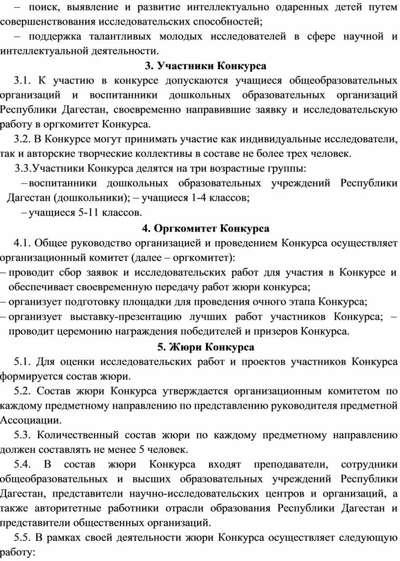3.1. К участию в конкурсе допускаются учащиеся общеобразовательных организаций и воспитанники дошкольных образовательных организаций Республики Дагестан, своевременно направившие заявку и исследовательскую работу в оргкомитет Конкурса.