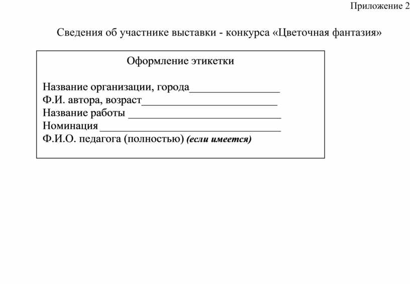 - двух этикеток на каждый экспонат, напечатанных на листе формата А-4, размером 7 х 9 см, где в горизонтальном положении, построчно, представлены сведения, согласно приложения 2.