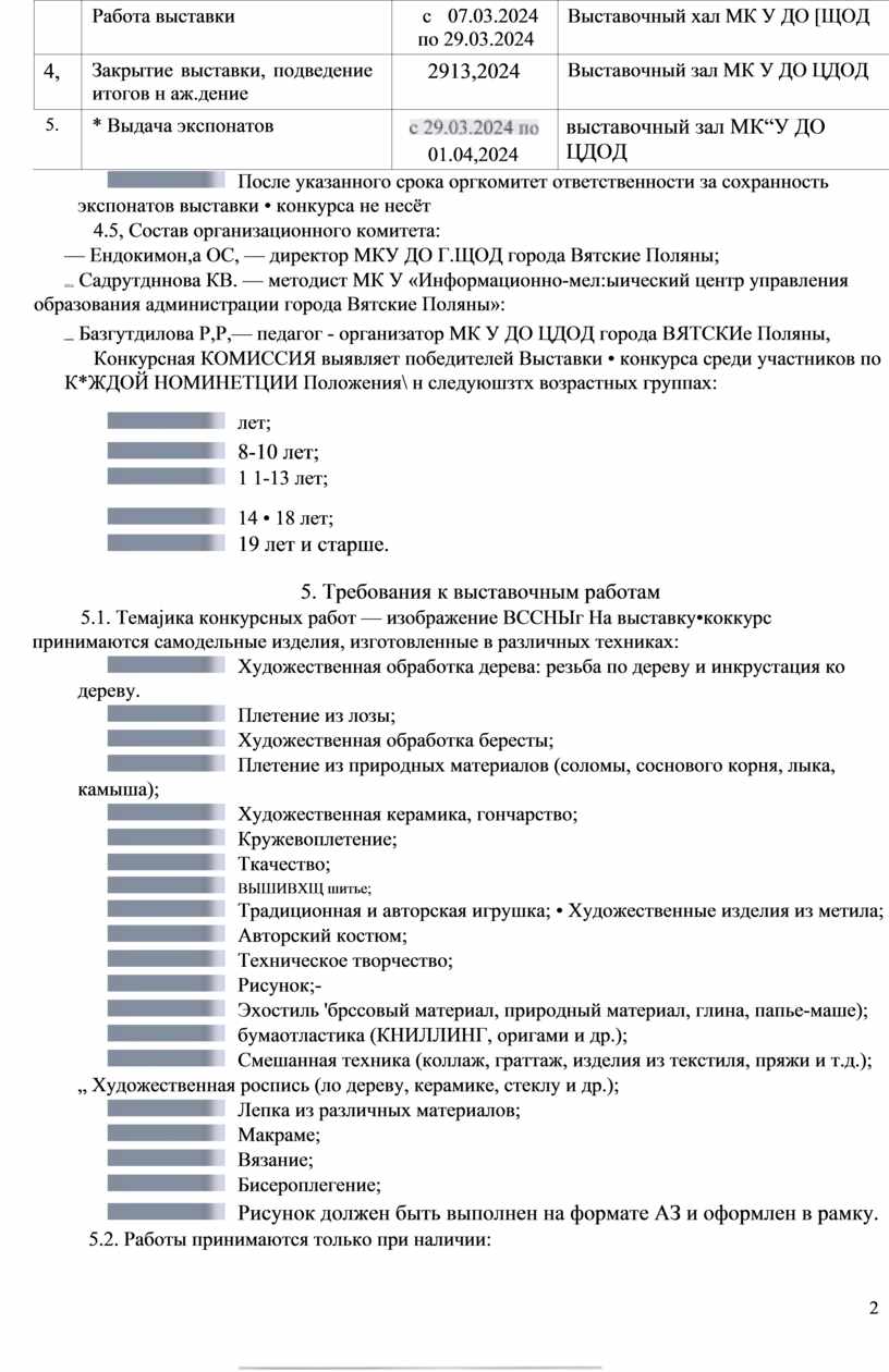4.1. Заявка на участие в выставке - конкурсе в печатном к электронном виде; творческие работы принимаются с 04 марта ло Об марта 2024 года в кабинете № МКУ ДО ЦДОД ледагогом-организатором Базгутдимовой Раилёй Раисовной.