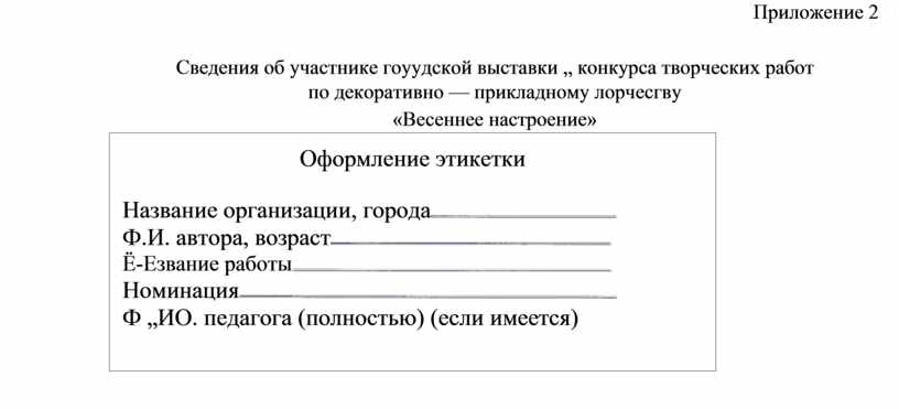 Оформление этикетки Название организации, города Ф.И. автора, возраст Ё-Езвание работы Номинация Ф „ИО. педагога (полностью) (если имеется) |