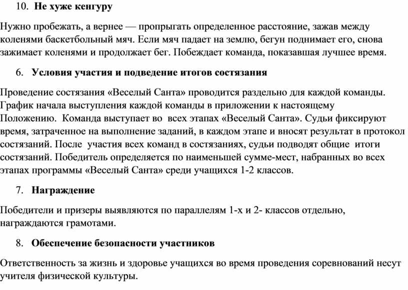 Проведение состязания «Веселый Санта» проводится раздельно для каждой команды. График начала выступления каждой команды в приложении к настоящему Положению. Команда выступает во всех этапах «Веселый Санта». Судьи фиксируют время, затраченное на выполнение заданий, в каждом этапе и вносят результат в протокол состязаний. После участия всех команд в состязаниях, судьи подводят общие итоги состязаний. Победитель определяется по наименьшей сумме-мест, набранных во всех этапах программы «Веселый Санта» среди учащихся 1-2 классов.