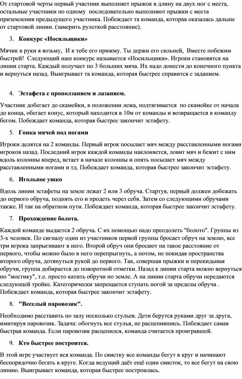 От стартовой черты первый участник выполняет прыжок в длину на двух ног с места, остальные участники по одному последовательно выполняют прыжки с места приземления предыдущего участника. Побеждает та команда, которая оказалась дальше от стартовой линии. (замерить рулеткой расстояние).