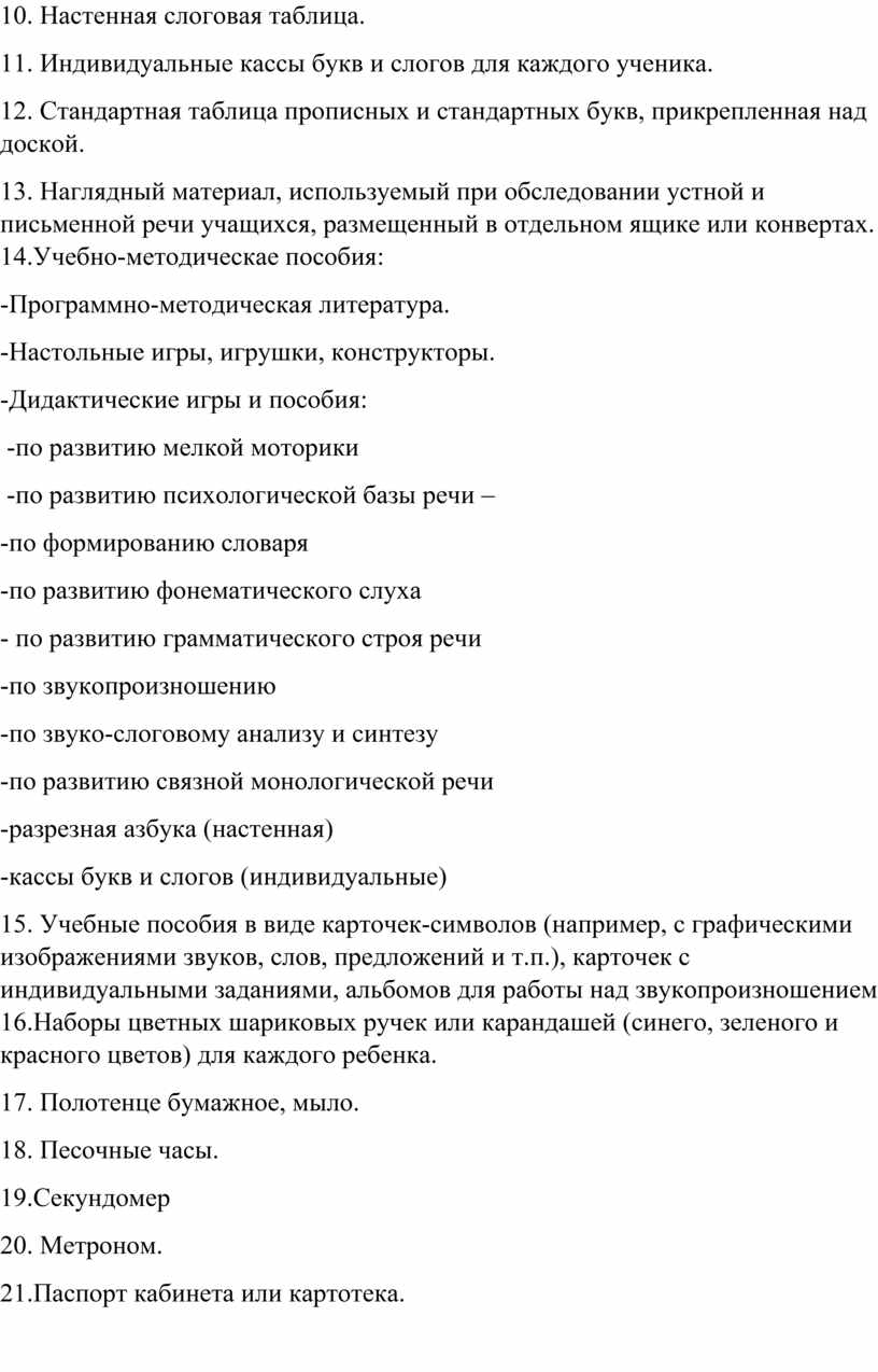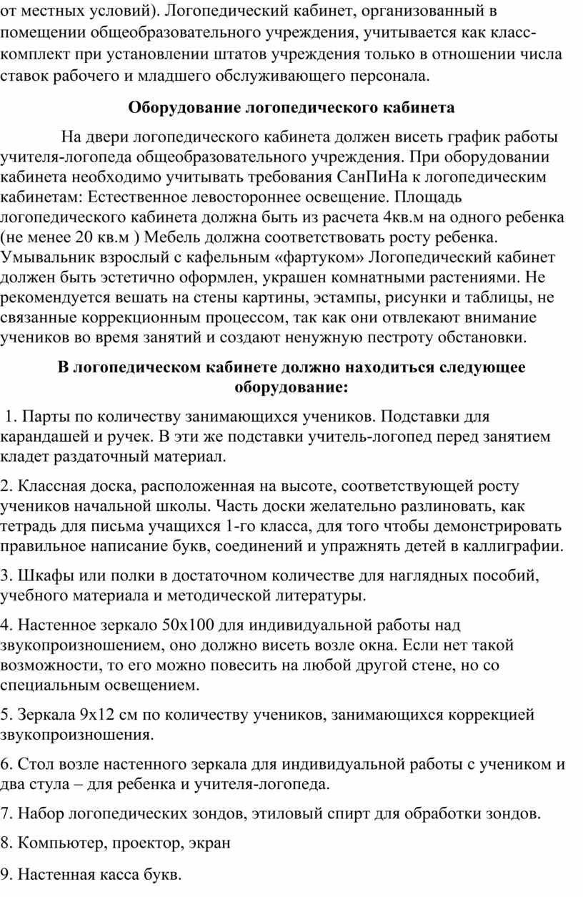 Для логопедического пункта выделяется кабинет площадью не менее 20 кв.м. отвечающий санитарно-гигиеническим требованиям. Логопедический кабинет обеспечивается специальным оборудованием, перечисленным ниже. На администрацию общеобразовательного учреждения возлагается ответственность за оборудование логопедического кабинета, его санитарное содержание и ремонт помещения. Логопедический кабинет размещается в помещении общеобразовательного учреждения (в зависимости от местных условий). Логопедический кабинет, организованный в помещении общеобразовательного учреждения, учитывается как класс-комплект при установлении штатов учреждения только в отношении числа ставок рабочего и младшего обслуживающего персонала.