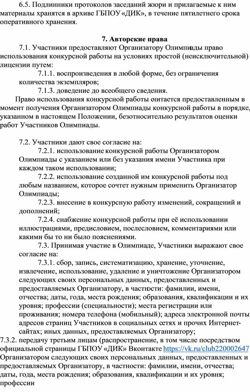 7.3.2. передачу третьим лицам (распространение, в том числе посредством официальной страницы ГБПОУ «ДИК» Вконтакте https://vk.ru/club220002647 Организатором следующих своих персональных данных, предоставленных и предоставляемых Организатору, в частности: фамилии, имени, отчества; даты, года, места рождения; образования, квалификации и их уровня; профессии (специальности); места и адреса работы, должности; города регистрации или проживания; адреса электронной почты.
