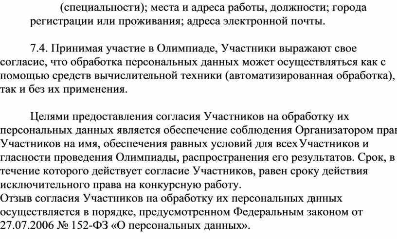 7.4. Принимая участие в Олимпиаде, Участники выражают свое согласие, что обработка персональных данных может осуществляться как с помощью средств вычислительной техники (автоматизированная обработка), так и без их применения.