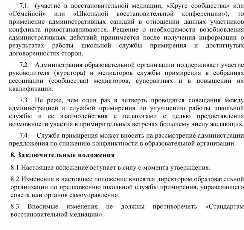 7.7. В случае если стороны согласились на примирительную встречу (участие в восстановительной медиации, «Круге сообщества» или «Семейной» или «Школьной восстановительной конференции»), то применение административных санкций в отношении данных участников конфликта приостанавливаются. Решение о необходимости возобновления административных действий принимается после получения информации о результатах работы школьной службы примирения и достигнутых договоренностях сторон.