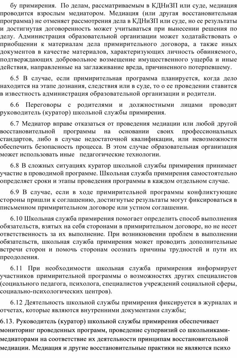 6.5 В случае, если примирительная программа планируется, когда дело находится на этапе дознания, следствия или в суде, то о ее проведении ставится в известность администрация образовательной организации и родители.