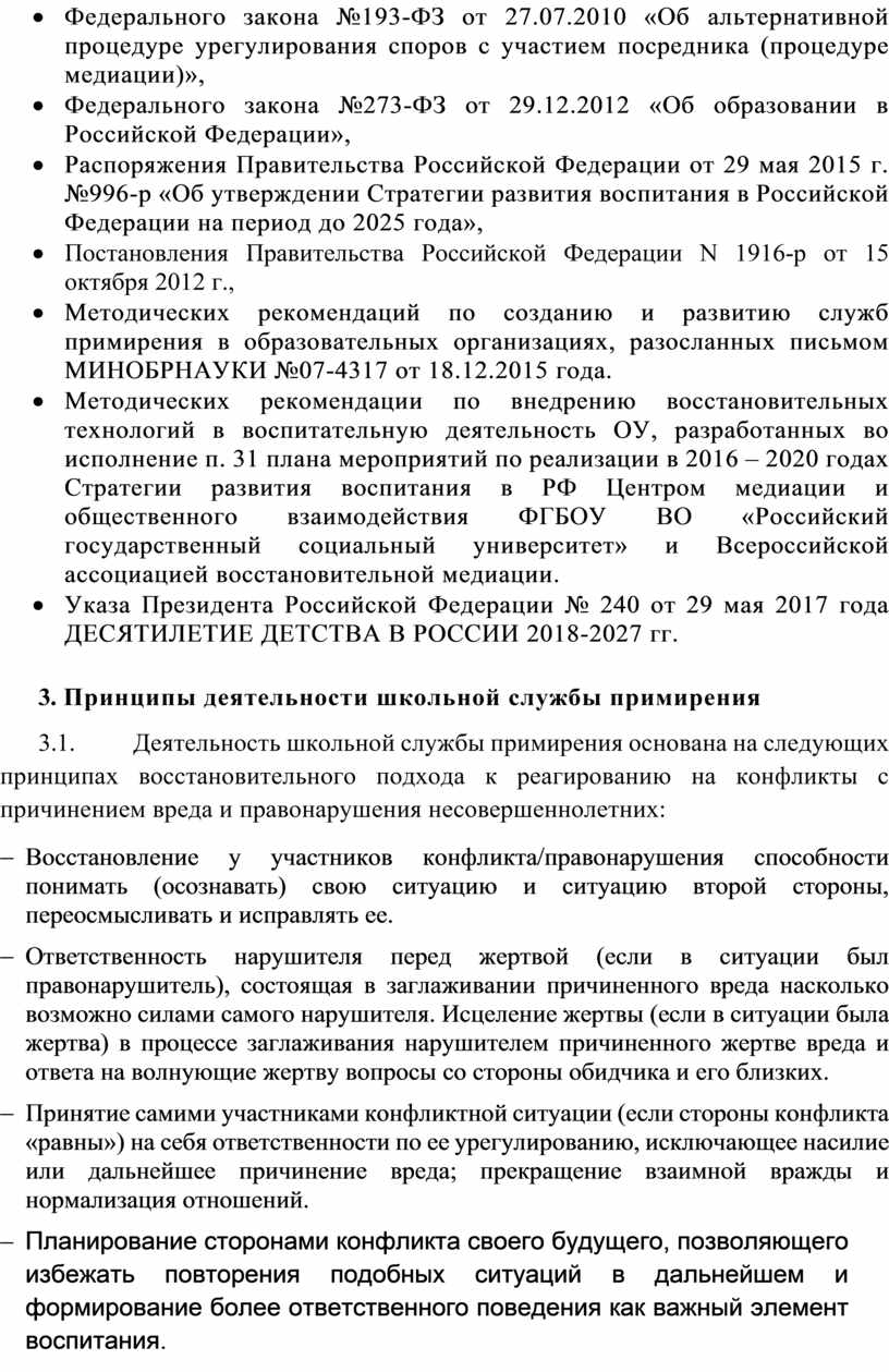 · Методических рекомендаций по созданию и развитию служб примирения в образовательных организациях, разосланных письмом МИНОБРНАУКИ №07-4317 от 18.12.2015 года.