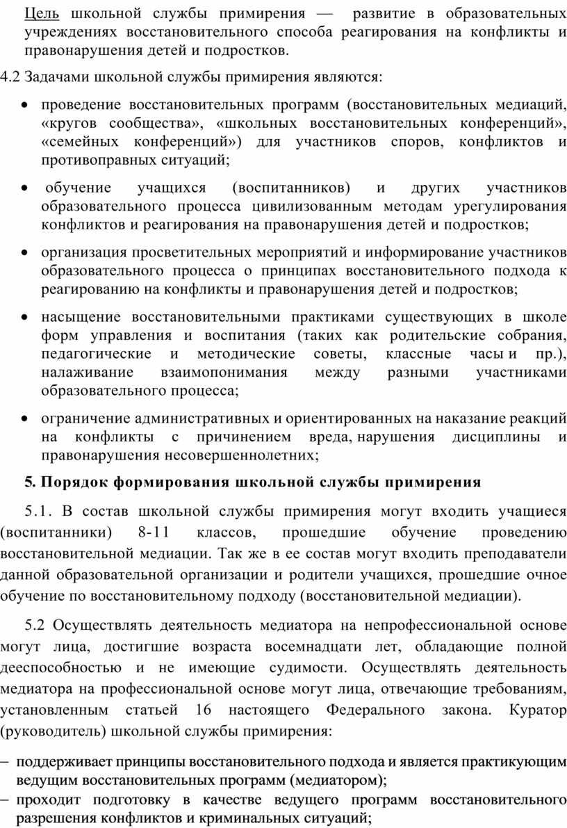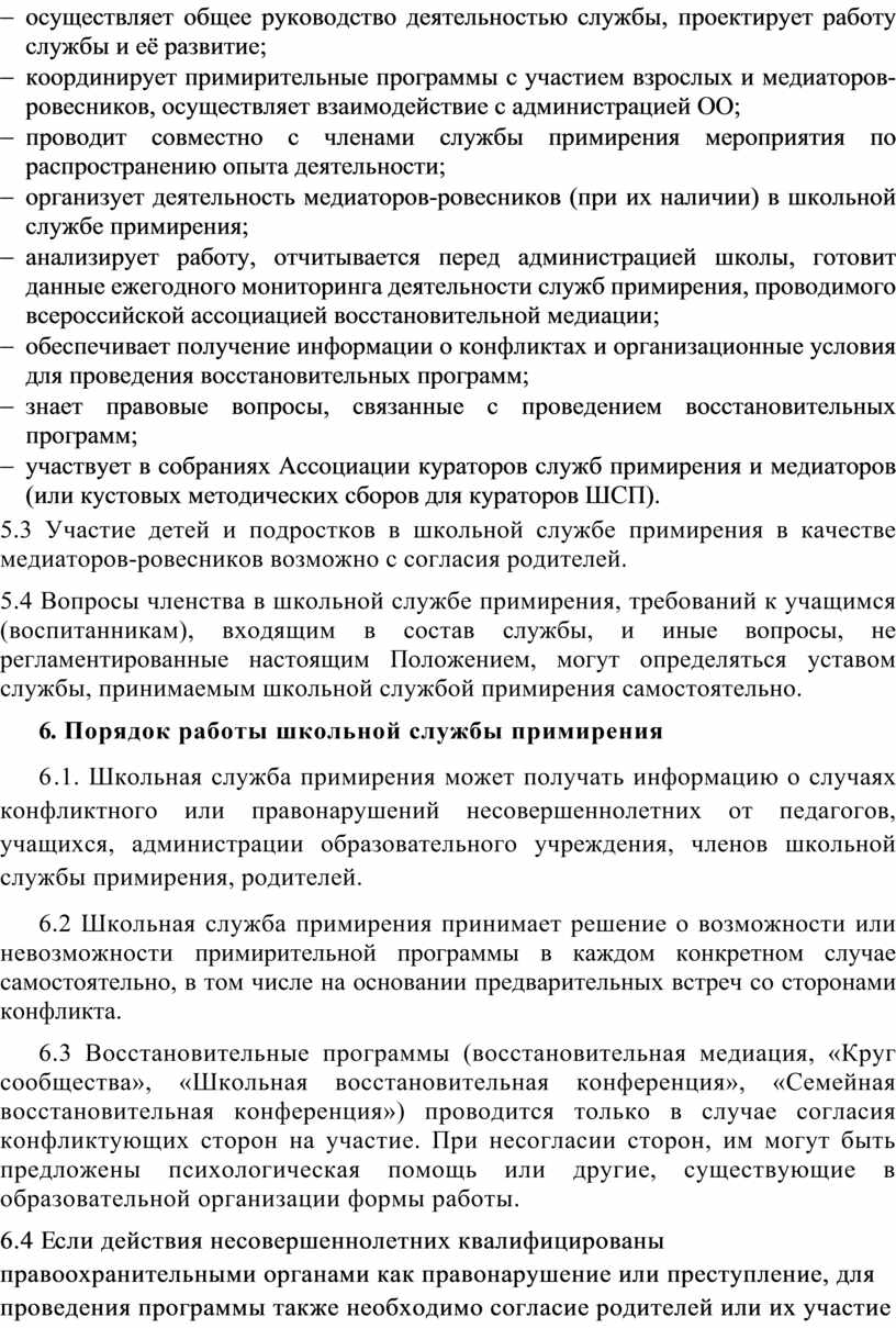 5.1. В состав школьной службы примирения могут входить учащиеся (воспитанники) 8-11 классов, прошедшие обучение проведению восстановительной медиации. Так же в ее состав могут входить преподаватели данной образовательной организации и родители учащихся, прошедшие очное обучение по восстановительному подходу (восстановительной медиации).