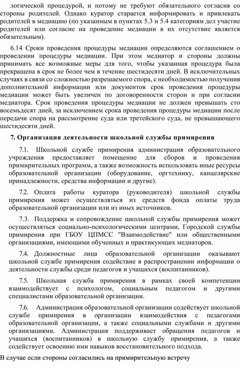 7.3. Поддержка и сопровождение школьной службы примирения может осуществляться социально-психологическими центрами, Городской службы примирения при ГБОУ ЦПМСС "Взаимодействие" или общественными организациями, имеющими обученных и практикующих медиаторов.