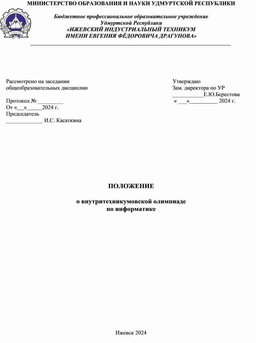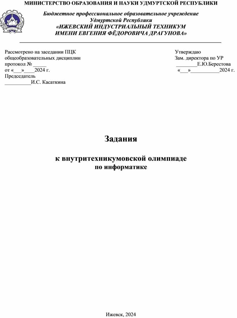 1.1. Внутритехникумовская олимпиада по дисциплине информатика (далее - олимпиада) для обучающихся Бюджетного профессионального образовательного учреждения Удмуртской Республики «Ижевский индустриальный техникум имени Евгения Федоровича Драгунова» (далее - техникум) призвана способствовать повышению качества среднего специального образования в интересах развития личности и ее творческих способностей, обеспечения профессиональной мобильности специалистов среднего звена.