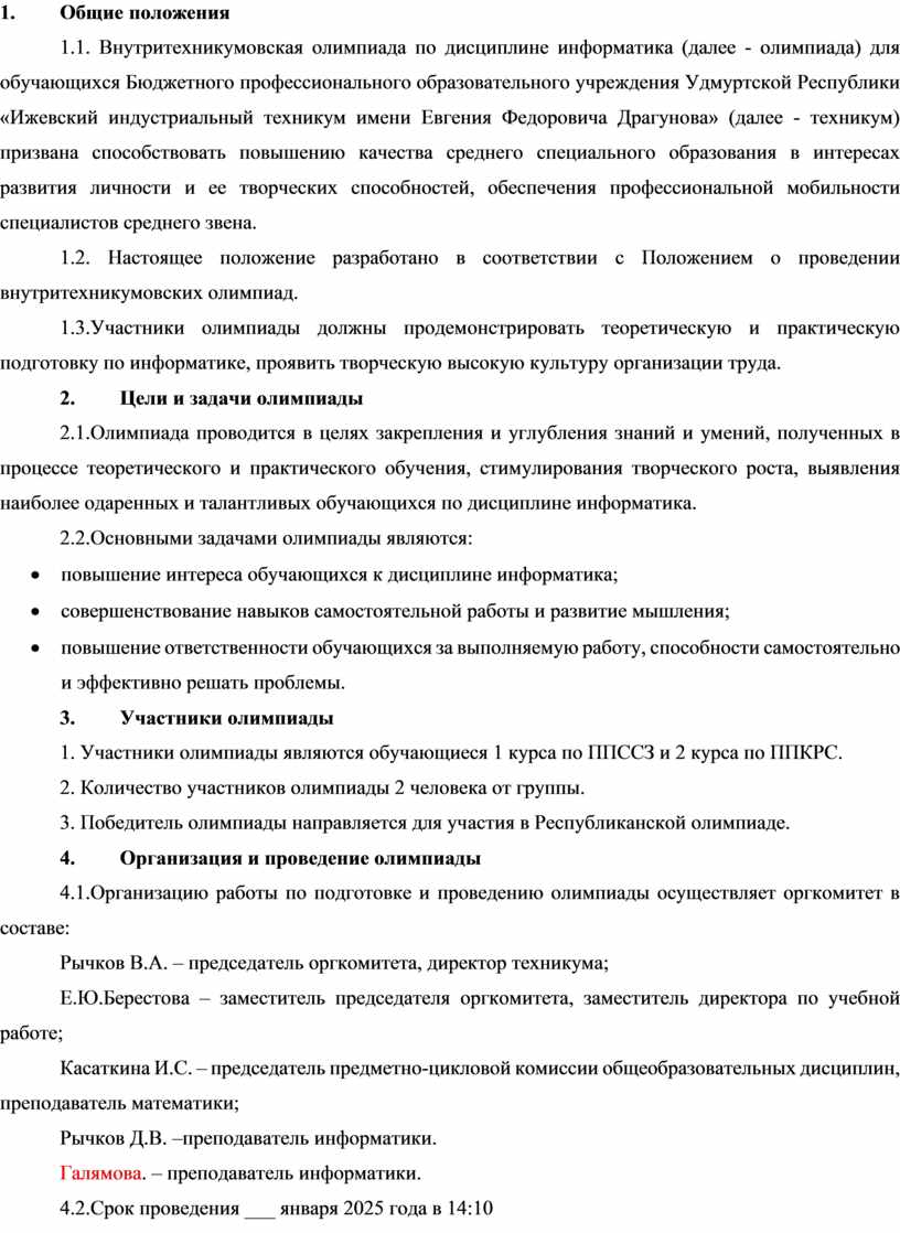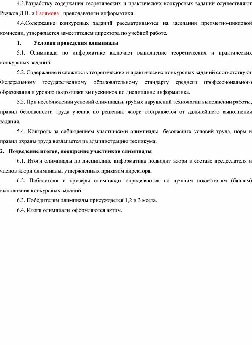 4.3.Разработку содержания теоретических и практических конкурсных заданий осуществляют Рычков Д.В. и Галямова , преподаватели информатики.