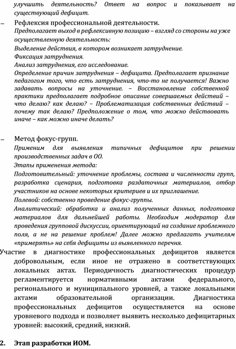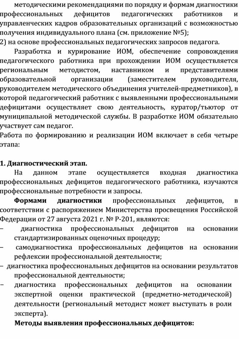 Разработка ИОМ осуществляется 1) на основе данных диагностики профессиональных дефицитов педагогических работников, осуществляемой в том числе в онлайн-формате, в соответствии с методическими рекомендациями по порядку и формам диагностики профессиональных дефицитов педагогических работников и управленческих кадров образовательных организаций с возможностью получения индивидуального плана (см. приложение №5);
