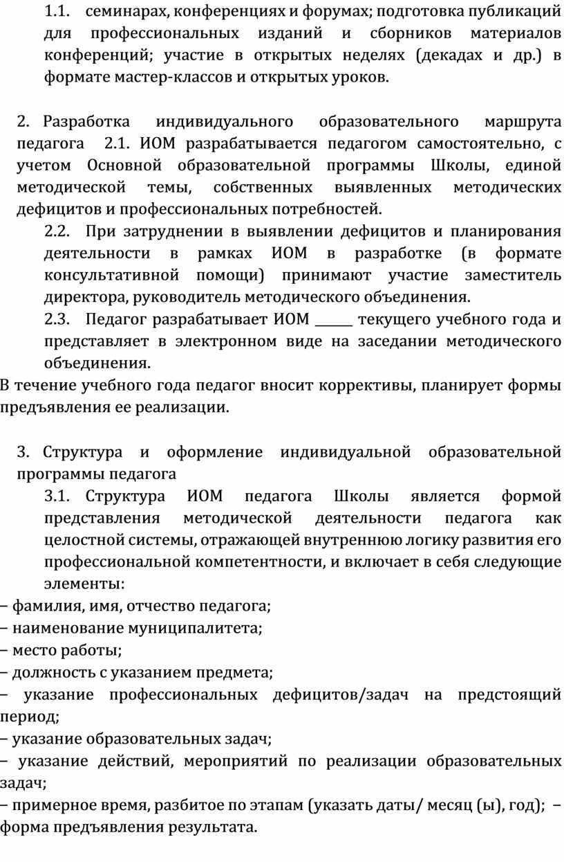 2. Разработка индивидуального образовательного маршрута педагога 2.1. ИОМ разрабатывается педагогом самостоятельно, с учетом Основной образовательной программы Школы, единой методической темы, собственных выявленных методических дефицитов и профессиональных потребностей.