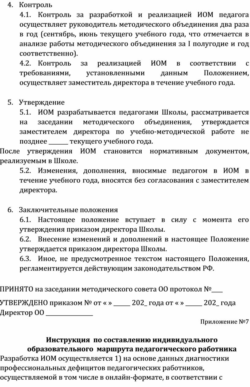5.1. ИОМ разрабатывается педагогами Школы, рассматривается на заседании методического объединения, утверждается заместителем директора по учебно-методической работе не позднее _______ текущего учебного года.