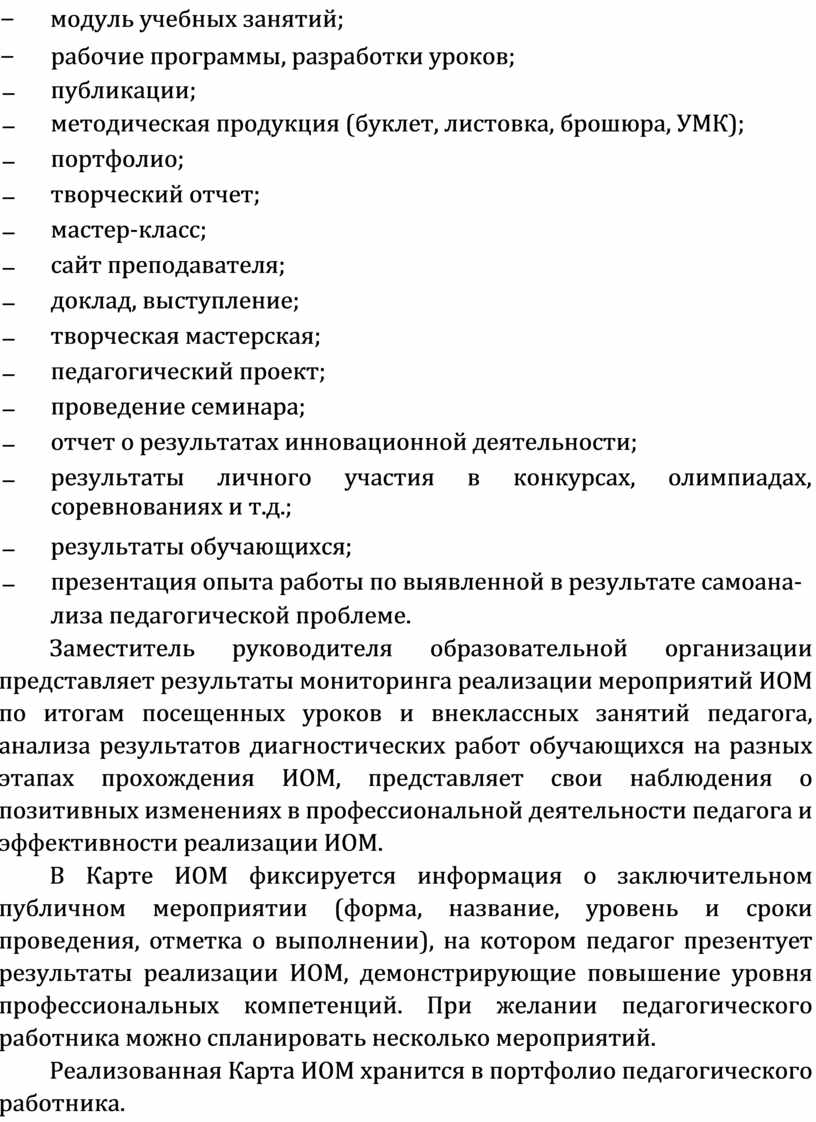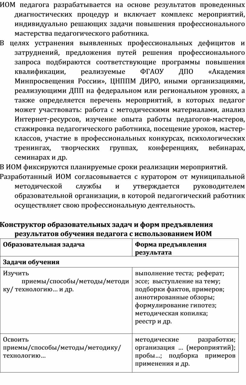ИОМ педагога разрабатывается на основе результатов проведенных диагностических процедур и включает комплекс мероприятий, индивидуально решающих задачи повышения профессионального мастерства педагогического работника.