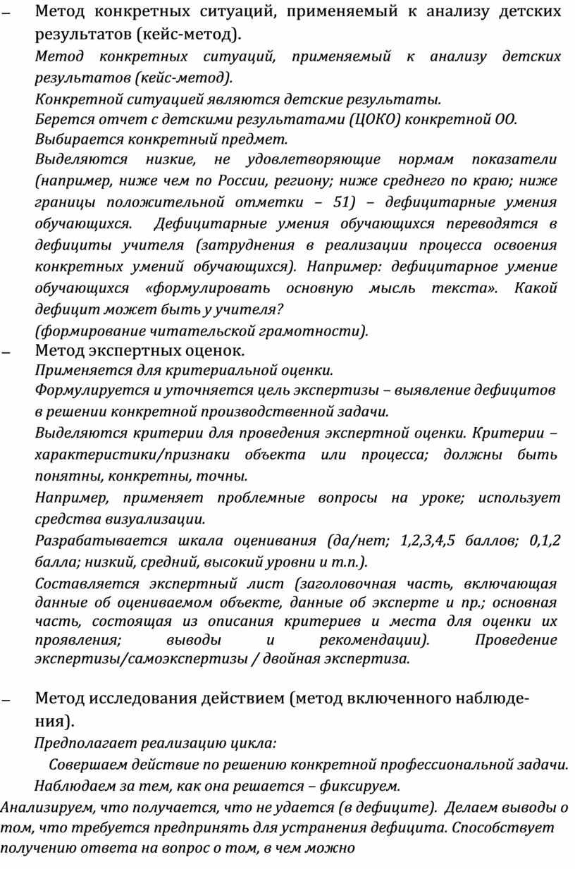 Метод конкретных ситуаций, применяемый к анализу детских результатов (кейс-метод). Метод конкретных ситуаций, применяемый к анализу детских результатов (кейс-метод). Конкретной ситуацией являются детские результаты. Берется отчет с детскими результатами (ЦОКО) конкретной ОО. Выбирается конкретный предмет. Выделяются низкие, не удовлетворяющие нормам показатели (например, ниже чем по России, региону; ниже среднего по краю; ниже границы положительной отметки – 51) – дефицитарные умения обучающихся. Дефицитарные умения обучающихся переводятся в дефициты учителя (затруднения в реализации процесса освоения конкретных умений обучающихся). Например: дефицитарное умение обучающихся «формулировать основную мысль текста». Какой дефицит может быть у учителя? (формирование читательской грамотности). |