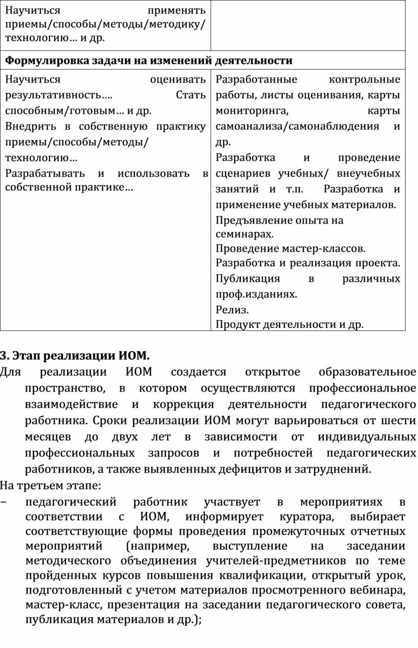 педагогический работник участвует в мероприятиях в соответствии с ИОМ, информирует куратора, выбирает соответствующие формы проведения промежуточных отчетных мероприятий (например, выступление на заседании методического объединения учителей-предметников по теме пройденных курсов повышения квалификации, открытый урок, подготовленный с учетом материалов просмотренного вебинара, мастер-класс, презентация на заседании педагогического совета, публикация материалов и др.); |