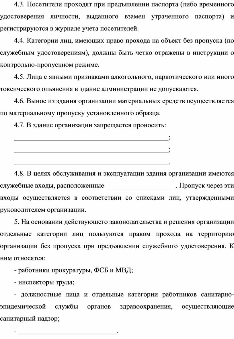 4.4. Категории лиц, имеющих право прохода на объект без пропуска (по служебным удостоверениям), должны быть четко отражены в инструкции о контрольно-пропускном режиме.