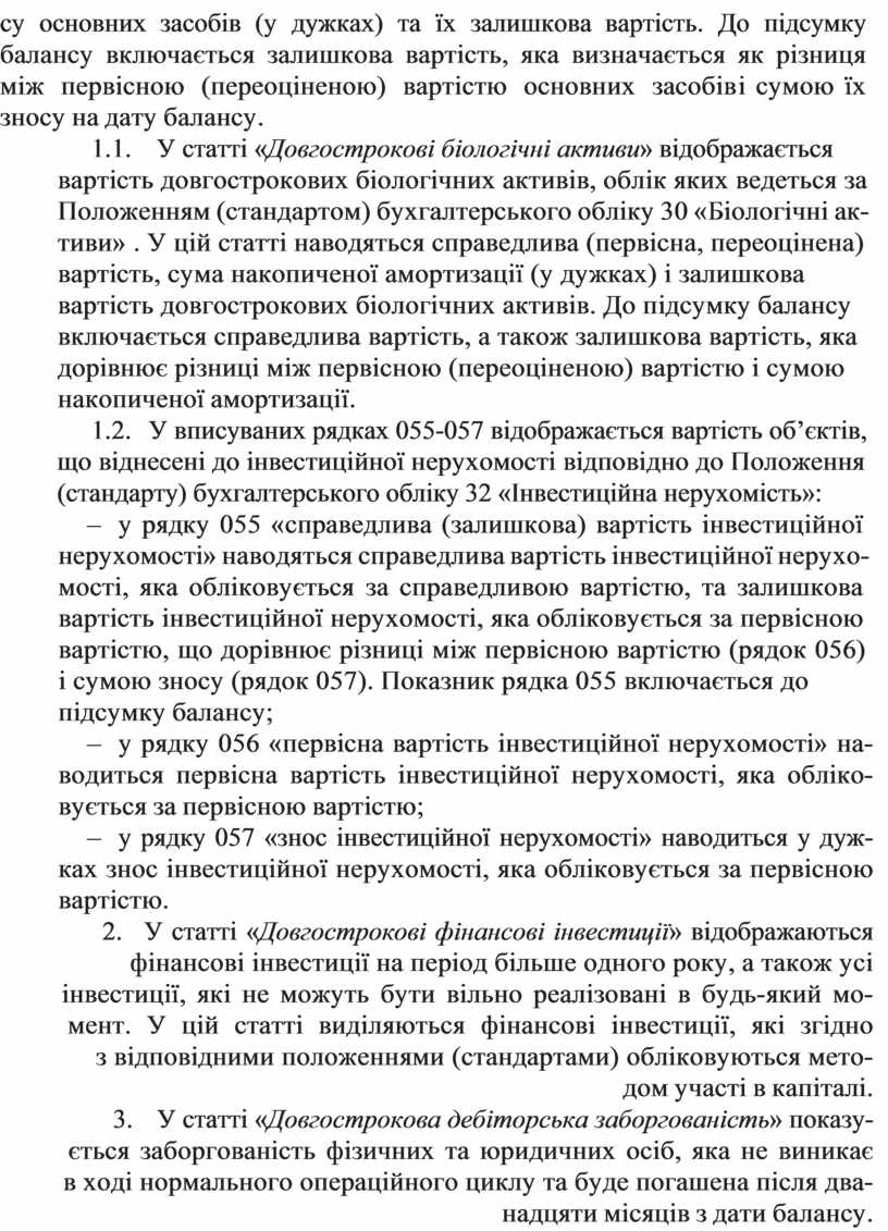 16.1. У статті «Довгострокові біологічні активи» відображається вартість довгострокових біологічних активів, облік яких ведеться за Положенням (стандартом) бухгалтерського обліку 30 «Біологічні ак- тиви» . У цій статті наводяться справедлива (первісна, переоцінена) вартість, сума накопиченої амортизації (у дужках) і залишкова вартість довгострокових біологічних активів. До підсумку балансу включається справедлива вартість, а також залишкова вартість, яка дорівнює різниці між первісною (переоціненою) вартістю і сумою накопиченої амортизації.