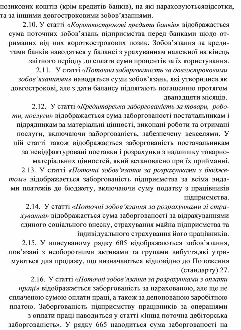 2.29. У вписуваному рядку 605 відображаються зобов’язання, пов’язані з необоротними активами та групами вибуття,які утри- муються для продажу, що визначаються відповідно до Положення (стандарту) 27.